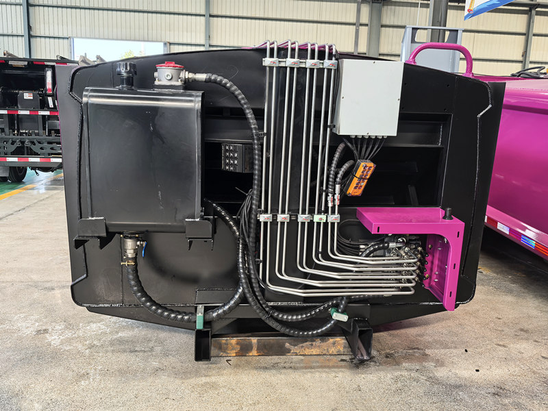 ●Zibil ýük awtoulagy düşüriş ýerine gelende, konteýneriň arka gapysy gidrawliki silindr arkaly açylýar we kompressiýa kamerasyndaky zibil deň derejede iteklenýär, bu bolsa arassa we çalt düşürilmegi üpjün edýär.