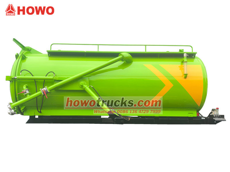 Optional MORO or Jurop pump“Howo 8cbm” çukur suw çykaryjy tankeriň göwresi esasan wakuum suw çykaryjy bakdan, wakuum nasosdan, suw çykaryjy turbadan, gözegçilik aýnasyndan we çykaryjy ulgamdan ybarat. Ol lagym suwlaryny we laýy suwlaryny sorup, saklap, daşamaga we çykarmaga ukyplydyr. Onuň wakuum ulgamy güýçli suw çykaryjy, septik baklardan we lagym guýularyndan çökündileri netijeli arassalap, ikinji derejeli hapalanmagyň öňüni alýar.